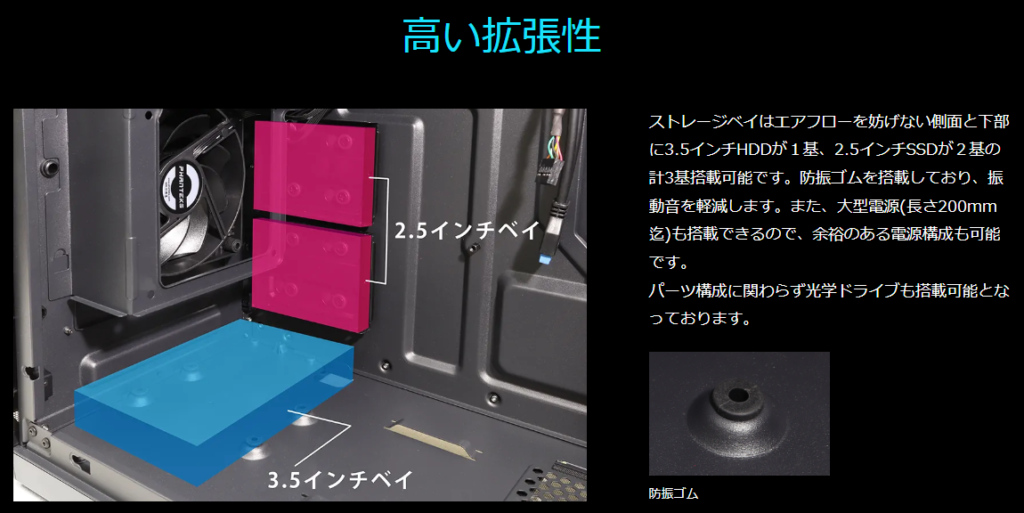 公式説明では「ストレージベイとして3.5インチHDDが1基、2.5インチSSDが2基の計3基搭載可能」とあります。